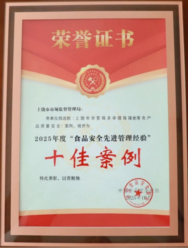 此次入选全国食品安全先进管理经验“十佳案例”,是对上饶市市场监管局探索构建农产品质量全链条监管体系成效的充分肯定。上饶市局将以此为契机,持续巩固既有整治成效,进一步推动食用农产品安全监管从阶段性攻坚向常态化、智慧化治理深化发展,切实筑牢从田间到餐桌的每一道安全防线,持之以恒守护好人民群众“舌尖上的安全”。(图文:上饶市市场监管局)