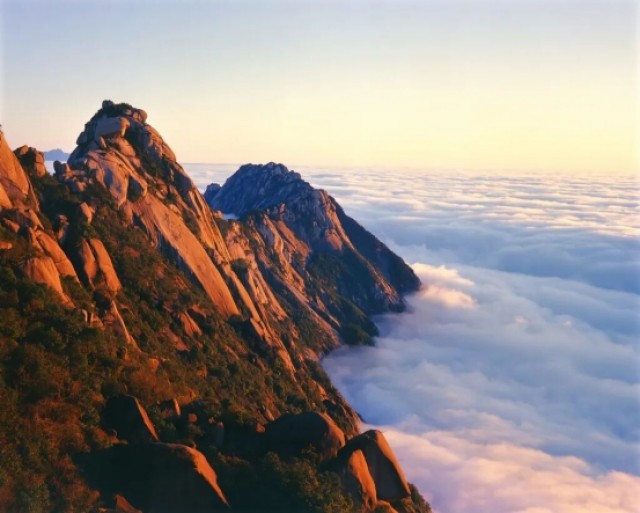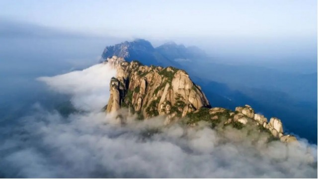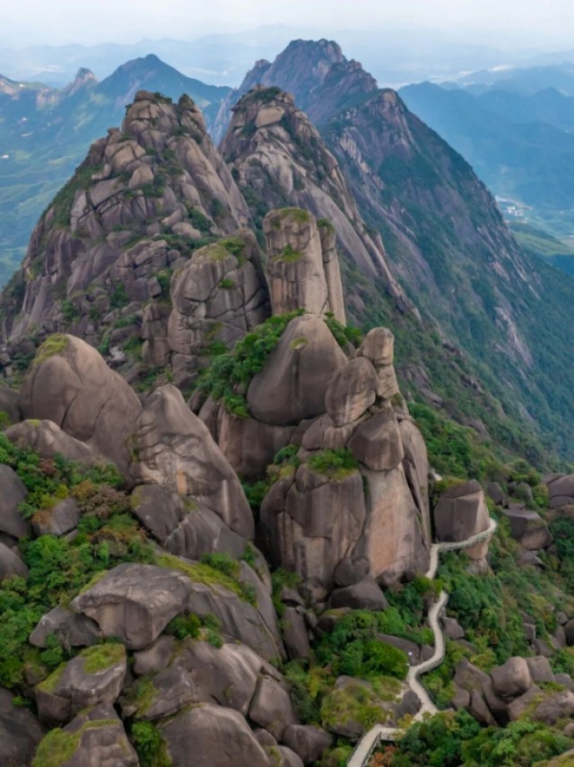亿万年前的燕山运动,让地壳深处的花岗岩破岩而出,经长期风化剥蚀与流水切割,形成了如今这条“龙脊”——主峰天梯峰海拔1496米,如龙头高昂;玉屏峰、望仙峰等群峰接踵绵延,似龙身蜿蜒;末段的石人峰孤峭挺立,若龙尾轻摆。山脊之上,怪石嶙峋,有的如龙鳞叠翠,有的似龙爪探云,最绝处莫过于“大鹏展翅”,两翼崖壁垂直耸立,宛如鲲鹏展翅翱翔天际,抬头可见天光如黛,尽显龙脊的雄奇险峻。山风掠过脊线时,松涛阵阵,宛如巨龙的沉吟,震撼人心。