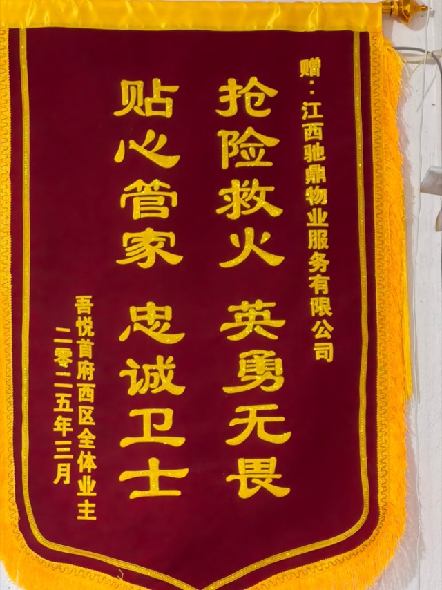 为了感谢陈骁对工作的高度负责精神,小区业委会与业主们商议后,给物业公司送来了一面锦旗。随后,上饶市消防大队也对他此次的英勇行为予以嘉奖,授予他“身边的救火英雄”称号,并颁发了荣誉证书。这面锦旗和荣誉证书,不仅是对陈骁个人的肯定,更是对江西驰鼎物业有限公司优质服务的高度认可。