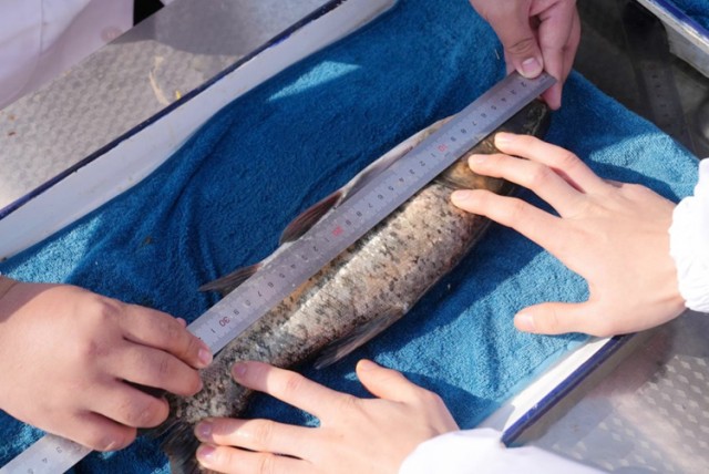 验收当日,万年县珍珠文化产业园内一派忙碌,专家组实地查看养殖池塘后,组织专业人员现场测产:刚捕捞的中科佳鳙1号被整齐摆放,工作人员手持精准量具逐一测量体长、称重记录,细致核对生长数据,同步统计成活率、规格等关键指标,通过实操与核验全方位验证养殖模式成效。