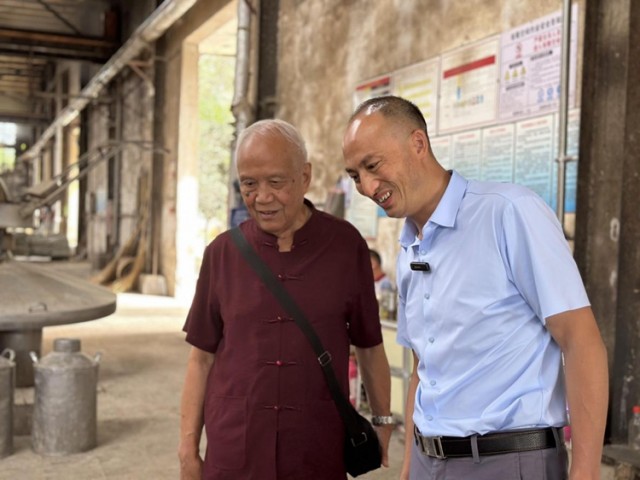 王杰(右)与白酒泰斗李大和(左)一起交流酿造技术