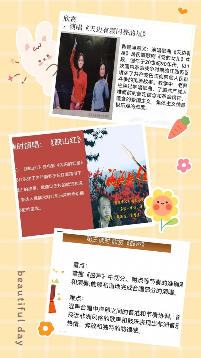 王书鸿老师针对八年级上册第一、二单元展开分享,第一单元以演唱《天边有颗闪亮的星》为核心,讲解了这首民族歌剧《党的女儿》经典唱段的背景与教学意义,引导学生体会革命精神与爱国情感;第二单元聚焦《映山红》教学,结合电影《闪闪的红星》背景,让学生理解歌曲中对红军的期盼与革命必胜的信念。