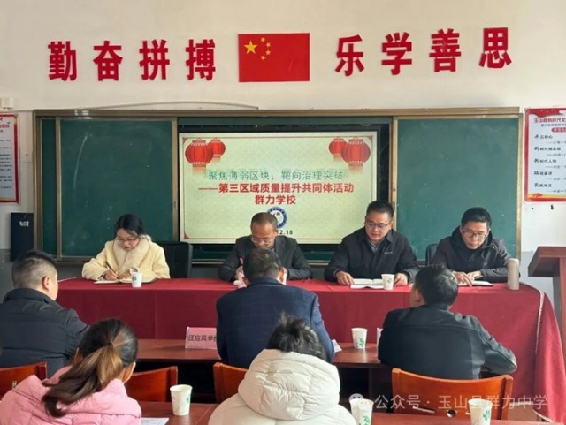 2025年12月18日上午,玉山县初中第三区域质量提升共同体“数理融于实践,衔接赋新能”主题教研活动在群力学校举行。汪应辰学校等七所学校校长、副校长及五、八年级数学教师代表参与,县教育发展研究中心主任沈佳红亲临指导。