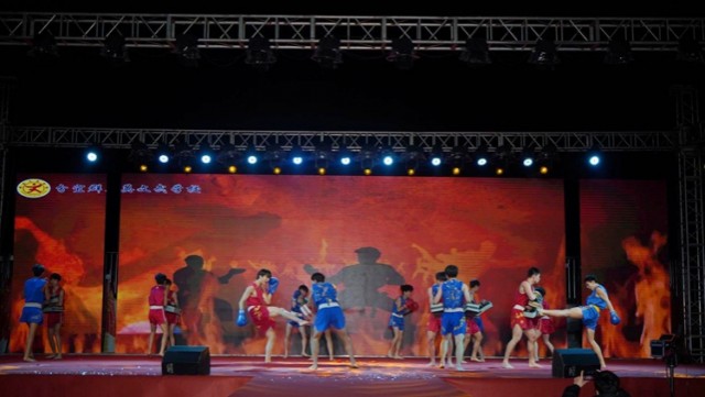 汇演的首个高潮,由气势恢宏的团体散打表演强势引爆。学员们身着统一散打服,抱拳行礼间尽显谦谦君子之风,礼毕旋即展开两两攻防。直拳快如闪电,摆拳势如破竹,鞭腿凌厉生风,正蹬力贯千钧。表演模拟真实实战情境,攻防转换瞬息万变,智慧与技巧相辅相成,力量与速度完美融合。