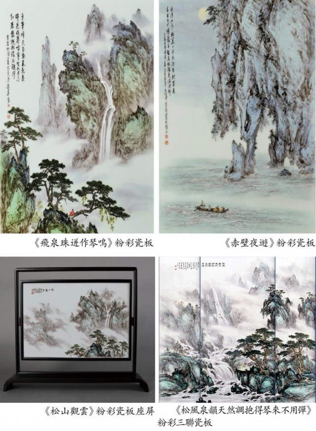 受家族繪瓷氛圍薰陶,江葆華自幼執筆弄墨。其先祖汪野亭作為“珠山八友”核心成員,是“汪派山水”的開創者,以瓷上青綠山水獨樹一幟,首創通景山水瓷瓶裝飾技法,將文人畫意趣融入陶瓷創作,構建起自成體系的用料用色範式。江葆華師從姑婆汪桂英、大伯汪平孫,潛心臨摹古意,盡得“汪派山水”筆墨精髓;又拜師滿維起、孫憲,精進國畫小寫意,融匯“外師造化,中得心源”的藝術理念。他傳承先祖用料用色體系,筆下粉彩山水清新潤澤,色彩明快,詩書畫印相映成趣,既延續文人畫精神,又以寫生為媒注入時代氣息。