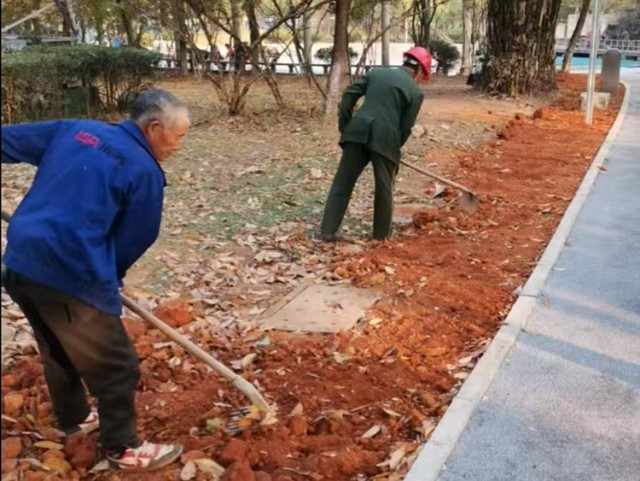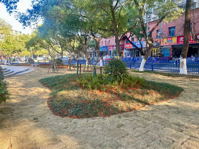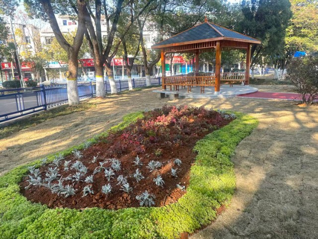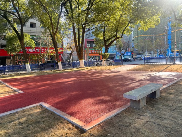 在金三角小游园的改造中,市公用事业服务中心坚决摒弃大拆大建的“大手笔”,秉持“厉行节约、反对浪费”的节俭精神,聚焦现有城市“微”空间的精雕细琢。改造过程中充分依托原有场地肌理,运入约400方土方营造错落有致的微地形,增强景观层次感与立体感;精心遴选佛甲草、玉簪、红枫、紫薇等十余种乡土植物进行科学配植,打造出四季有景、色彩丰富的绿化景观。同时,将约400平方米老旧吸水砖路面升级为平整美观的红色透水混凝土路面,同步优化扩大活动广场面积;拆除存在安全隐患的老旧亭子,新建一座稳固雅致的四角木亭,并对园内三座“金字塔”造型亭进行刷漆翻新。这一系列“微更新”组合拳,以有限的投入最大化提升了游园的生态性、安全性与休闲服务功能,使之成为周边居民茶余饭后休闲散步的优选之地。