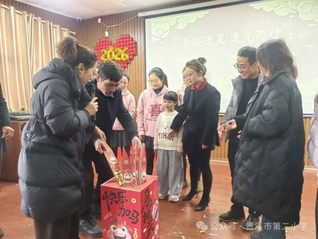 活动的最后,迎来了备受期待的“龙马精神送福来”环节。在欢乐动感的音乐中,教师代表轮流从“幸运签筒”中抽取马年幸运签。每一支幸运签上都写有美好的祝福与寓意,随着一份份幸运与祝福被送出,会场内惊喜连连,笑声不断,将整场活动的气氛推向最高潮。