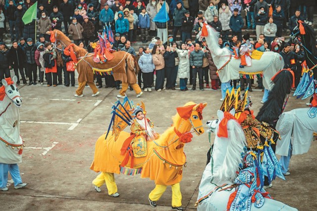 2月7日,南京市高淳区阳江镇丹湖村孙家宕自然村,时隔10余年的百年跑马灯民俗活动再度开启。现场锣鼓铿锵,旗幡飘扬,40人马灯队伍化身三国、杨家将中经典人物,通过灵活多变的阵型,生动演绎这项融舞武戏乐为一体的传统民俗。活动将持续至3月8日,共上演8场。(邵丹 通讯员 刘列 摄)