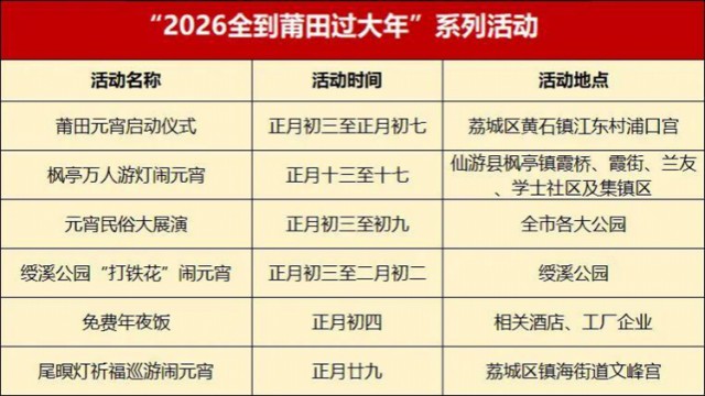 莆田萝苜田历史文化街区(舞龙舞狮、古戏台戏曲)→双福村(“板凳龙”游灯闹元宵)→绶溪公园(千灯节、无人机秀、打铁花等民俗)→九鲤湖风景区→枫亭镇(枫亭万人游灯闹元宵)→平潭仙人井景区→北港村(感受“石头会唱歌”)→镜沙村→长江澳→壳丘头遗址博物馆(探寻南岛语族起源)→平潭澳前台湾小镇(新春启程台味潮年活动)