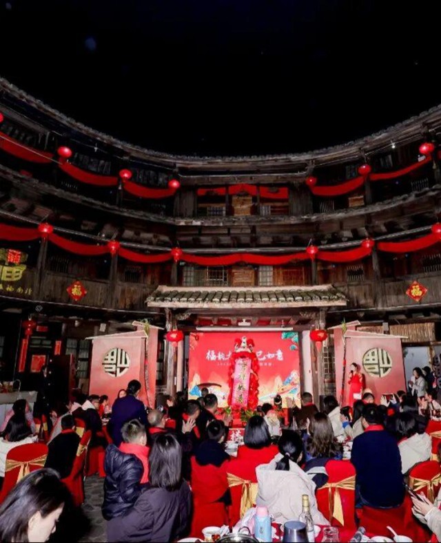 除夕夜与正月初一晚上,南靖“土楼过大年”新春团圆宴热闹开席,来自全国各地的游客纷至沓来,欢聚福谦楼,现场张灯结彩,喜气融融,处处洋溢着团圆的温馨与喜悦,呈现出“福气同享家宴共品”的盛大围炉景象,远来的宾客朋友与本地的民众围坐一堂,共享新春团圆时刻。
