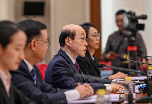 3月3日,全国政协十四届四次会议新闻发布会在北京人民大会堂举行。大会新闻发言人刘结一向中外媒体介绍本次大会有关情况并回答记者提问。这是记者在发布会上采访。陈晔华 摄