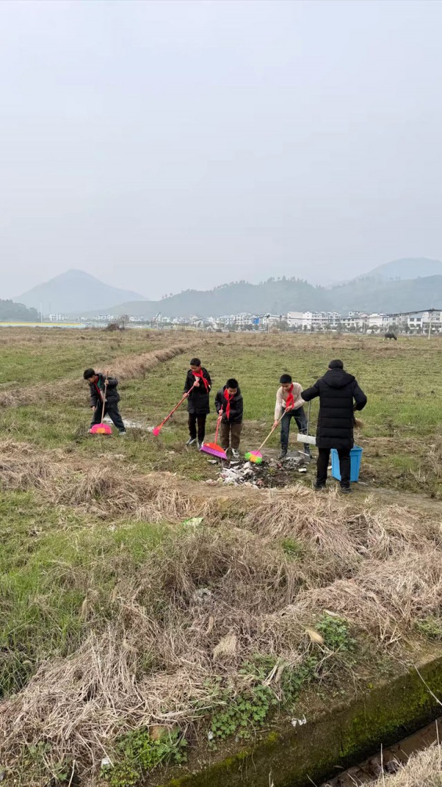 活动中,师生们分为多个小组,分别负责校园周边、乡村道路及田野区域的卫生清理。在校园外,党员教师与学生一起拿起扫帚、垃圾袋,对街道旁的落叶、纸屑进行清扫,配合默契。孩子们认真细致,不放过任何角落。