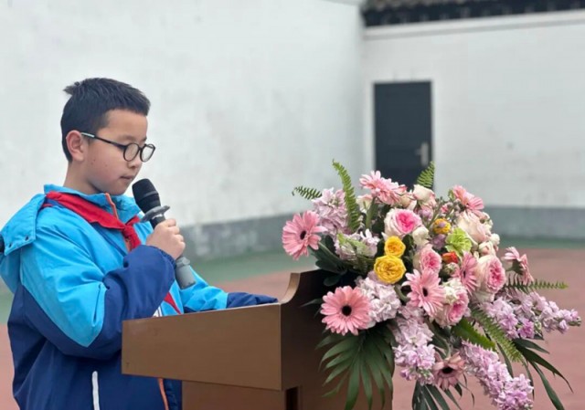 优秀学生代表董骏轩号召同学们新学期养成好习惯,努力学习,积极参加活动,做一名全面发展的少年。