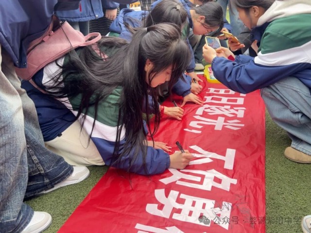 高三(1)班查文贝同学分享备考心得,全体高三教师在高本祥老师带领下庄严宣誓,张宝林老师带来励志演讲,为学生注入精神力量。全体学生高考冲刺宣誓,音乐部学生合唱励志歌,学子们穿越“成人门”“金榜题名门”,投放心愿卡,并在横幅上签名。