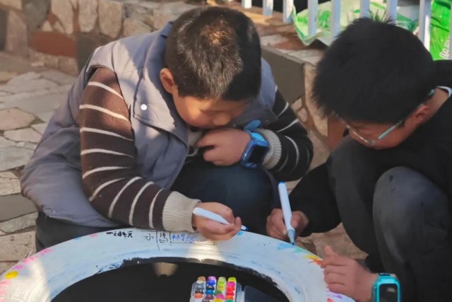 活动现场,孩子们围坐一堂,手持多彩画笔在洁白的轮胎上尽情挥洒创意。稚嫩的笔触下,五彩花朵、挺拔小树、爱心图案等栩栩如生,每一笔一划都饱含着对自然的无限热爱。暖阳下,原本废弃的轮胎在巧手中焕发新生,成为充满童趣的艺术作品,生动展现了孩子们的环保智慧。