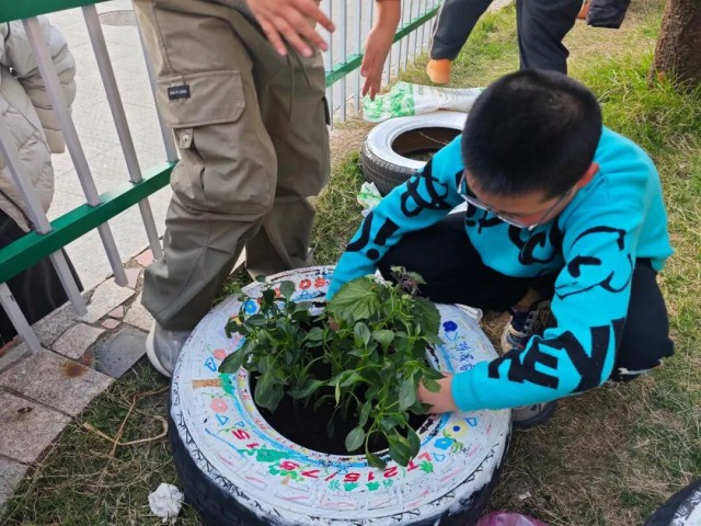 彩绘完成后,少先队员们分工协作,亲手为轮胎花盆填入沃土,移栽绿植幼苗。部分同学还在成品上写下“爱护绿植”等温馨标语,以实际行动呼吁大家共同守护这份绿色成果。废弃轮胎在劳动中焕然一新,不仅装点了校园,更承载起孩子们的责任与希望。