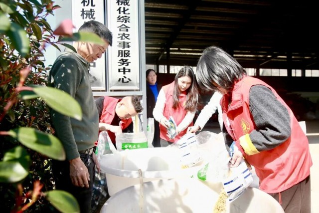 在桐畈镇高厅村农资储备区,种粮大户姜奀水正和身穿红马甲的党员志愿者分工配合,把精心挑选的稻种倒进容器,按照农技标准配药消毒、温水浸种,一丝不苟做好每一个环节。“给种子泡个‘温水澡’,出苗才整齐健壮。”姜奀水笑着说,有技术、有帮手,2026年肯定又是一个丰收年。