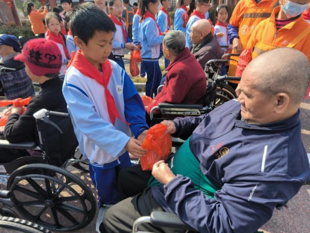 文艺表演结束后,党员教师与少先队员怀着真诚的心意,将精心准备的礼品一一送到老人手中,一声声“爷爷好”“奶奶好”,饱含着师生们的深切关怀,老人们接过礼品,脸上洋溢着幸福的笑容。