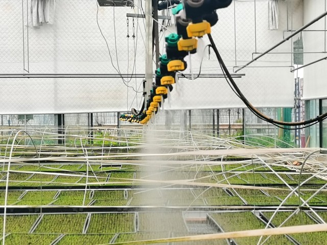 育秧大棚内,智能化温控和喷灌系统正在悄然运行、精准赋能。管理人员只需通过手机APP,便可实时监控大棚内的温度、湿度,精准掌握秧苗生长动态;一旦某片区域出现缺水情况,系统便会自动报警,轻点手机屏幕,精准补水即刻完成。这种数字化、智能化管理手段,既大幅降低了人工成本,也让秧苗始终生长在最适宜的环境中,有效提升了秧苗成活率。