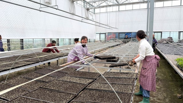 在现代化的集中育秧中心,映入眼帘的是一派热火朝天的生产景象:工人们将育秧盆有序搬进温室大棚,两条全自动水稻育秧流水线开足马力、高速运转,工人们熟练配合机器摆盘,动作行云流水、井然有序,每一道工序都透着高效与专业。