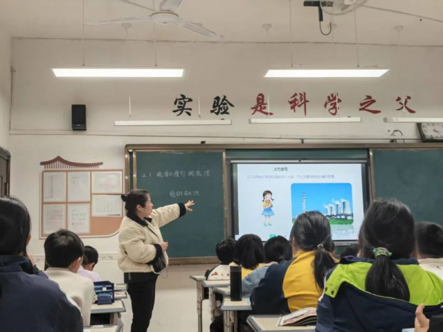科学课上,童海华老师执教《电和我们的生活》,以情境导入激发兴趣,引导学生认识电的广泛用途,区分家庭用电(220V)和电池电(直流电)。课堂通过图片辨析、口诀记忆等方式,讲解安全用电与节约用电常识,帮助学生树立安全用电意识,掌握正确用电行为。