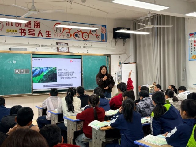 语文课上,黄海燕老师执教《绿》,立足单元整体教学,激发学生对诗歌的兴趣。课堂以多种形式的反复朗读为主线,创设情境、激发想象,让学生在诵读中感受现代诗的节奏与韵律,体会诗歌意境与诗人情感,有效培养了学生的语感与审美能力,课堂诗意盎然。