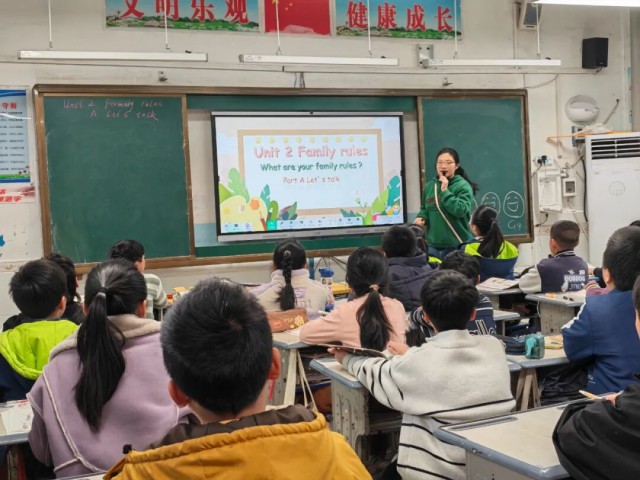 英语课上,刘昀老师执教《Familyrules》,以歌曲导入,结合生活经验引出主题。课堂通过听音、看图、角色扮演等活动,帮助学生掌握核心句型,理解情态动词用法。最后联系生活创编对话,注重听说能力与安全意识培养,课堂互动高效。