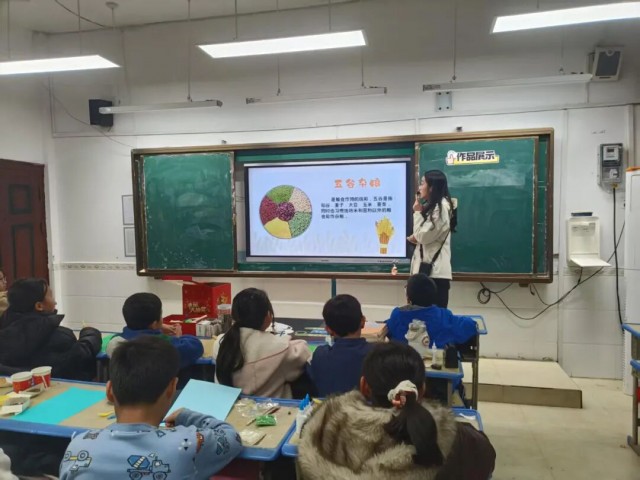 美术课上,何雪老师执教《五谷作画》,以百宝箱导入,介绍五谷画历史与创作手法。课堂通过示范讲解步骤,引导学生动手实践、小组合作,完成五谷作品创作。最后进行展示评价,既提升了学生动手与创新能力,也让学生感受传统文化魅力。