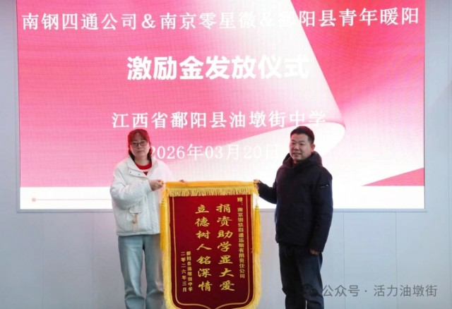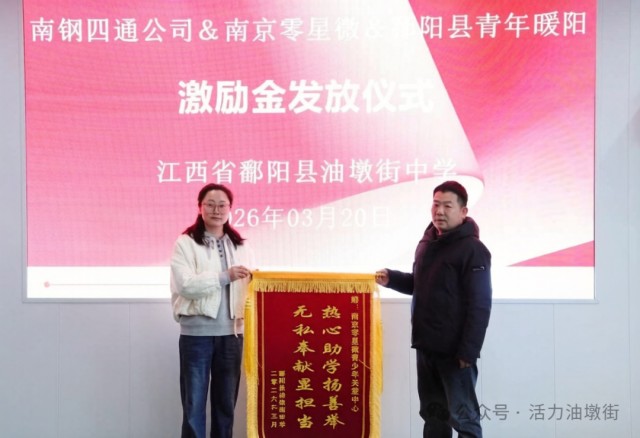 阳春三月,惠风和畅。2026年3月20日,鄱阳县油墩街中学内暖意涌动,南京钢铁四通运输有限公司、南京零星微青少年关爱中心联合鄱阳县青年暖阳联合会,在此举行爱心助学激励金发放仪式,为17名品学兼优学子送上温暖与期许。