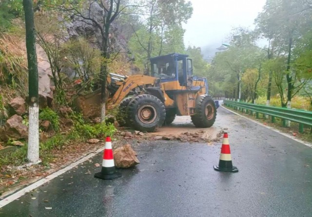 在S201紫岭线K134+600米路段,受持续降雨影响,边坡突发山体落石,大量石块、泥土侵占路面,形成通行障碍。接报后,该中心迅速调派装载机等机械设备驰援现场,采取“人机协同”作业模式,对路面落石及淤泥进行全面清理。在清障过程中,养护人员同步对边坡开展细致排查,严防二次险情发生。经高效处置,该路段隐患及时消除,道路快速恢复畅通,切实保障了群众出行安全。