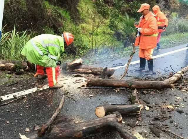 在S202白东线K104+200米处,一棵枯树因雨水冲刷导致根部松动,枝干倾斜横跨路面,严重影响行车视线并威胁通行安全。险情发生后,该中心立即启动应急处置预案。养护人员冒雨赶赴现场,第一时间设置警示标志并疏导过往车辆,随后在湿滑复杂的作业环境中开展清理作业。养护人员克服风雨干扰,利用油锯、绳索等专业工具对倒伏树木进行切割与分段清运。经过紧张有序的施工,倒伏树木被彻底清除,该路段迅速恢复正常通行。