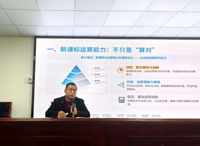 最后是朱子中学教务主任方金林主讲的《初中生计算能力培养的思考与探究》专题讲座。他结合自己的教学实际,分析了学生计算能力方面存在的问题,并从教学方法优化、习题设计创新、习惯养成引导、思维训练强化等维度,向老师们分享了自己的培养策略与教学建议。讲座内容贴合教学实际,操作性强,为老师们在教学中提升学生计算能力给予了很好的借鉴。