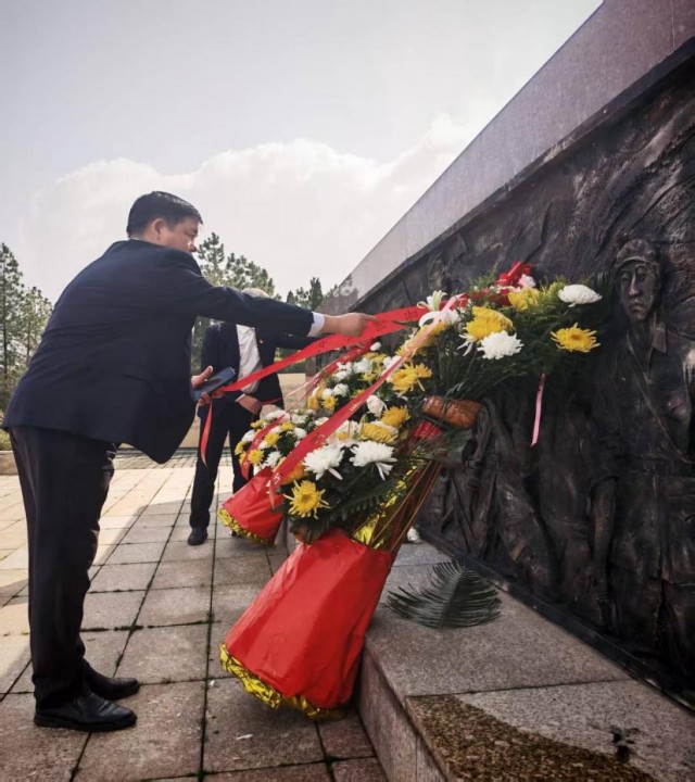 “青山绿水留浩气,苍松翠柏慰英灵。”师生代表在《献花曲》中缓步上前,向烈士纪念碑敬献花圈,并仔细整理缎带。花圈承载着全体师生的哀思与敬意,缎带迎风轻扬,诉说着新时代少年对革命先烈的缅怀之情,也彰显着红色精神的代代传承。