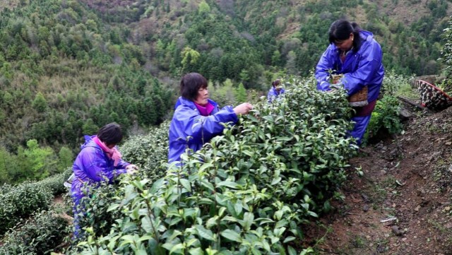 茶园里,村民们腰挎竹篓,指尖在茶枝间灵巧翻飞,严格按照一芽一叶的标准,精准采摘每一片鲜嫩茶芽,动作娴熟利落。“采茶工作门槛低,既能照顾家里,又能赚钱,每天都有150元收入。”正在采茶的村民汪芙霞对记者说。