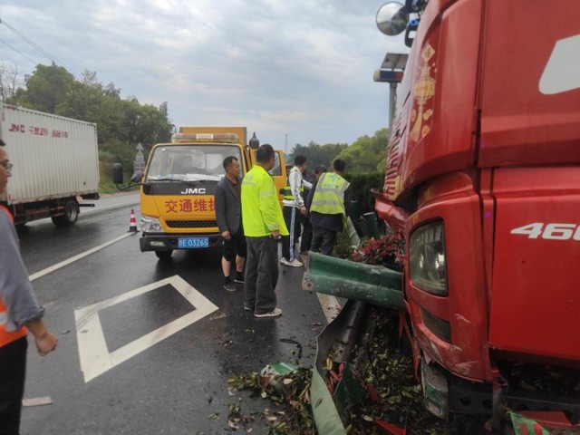 2026年4月2日17时许,信州区G320国道东仓路口段突发交通事故,两辆大货车刮擦碰撞,致使道路中分带护栏损毁变形,半幅路面被占,车辆拥堵滞留,通行严重受阻。