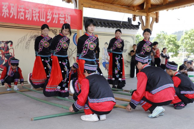 广场中央,最热闹的当属竹竿舞环节。伴随着清脆的“哒哒、开合”竹竿敲击声,来自铁山中学的畲族学生们身着民族服装,手拉手跳起了竹竿舞。她们步伐轻快,笑容灿烂,在分合的竹竿间灵活穿梭,引得围观群众掌声阵阵。